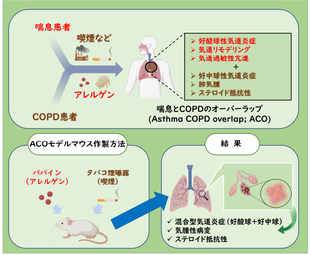 喘息は主にアレルゲン、COPDは主に喫煙と、それぞれ異なる原因で発症する呼吸器疾患です。一方、両者を併発した場合はACOと呼ばれ、それぞれの疾患の特徴を併せ持った複雑な病態を示します。ACOは既存の喘息やCOPD治療薬では十分な治療効果が得られないため、新たな治療薬が求められています。しかしながら、その複雑な病態を忠実に再現した疾患モデル動物が確立されておらず、病態解明が遅れていました。