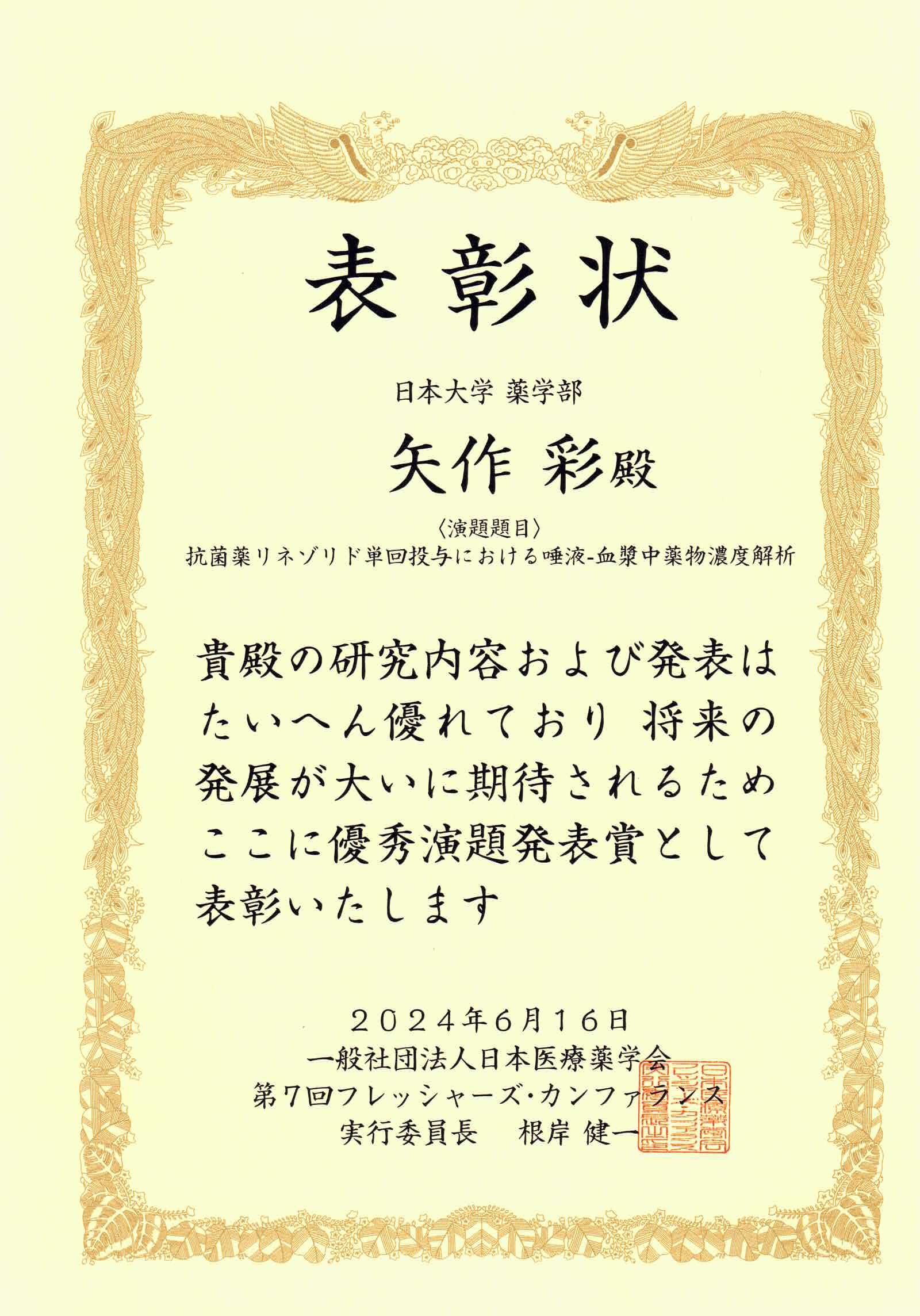 日本医療薬学会第7回フレッシャーズカンファレンスにおいて、本学学生が受賞しました。 6月15日~16日まで北里大学薬学部で開催された日本医療薬学会第7回フレッシャーズカンファレンスにおいて、薬剤師教育センター所属の矢作彩さん(6年生)が「優秀演題発表賞」(ポスター発表)を受賞しました。 演題「抗菌薬リネゾリド単回投与における唾液-血漿中薬物濃度解析」