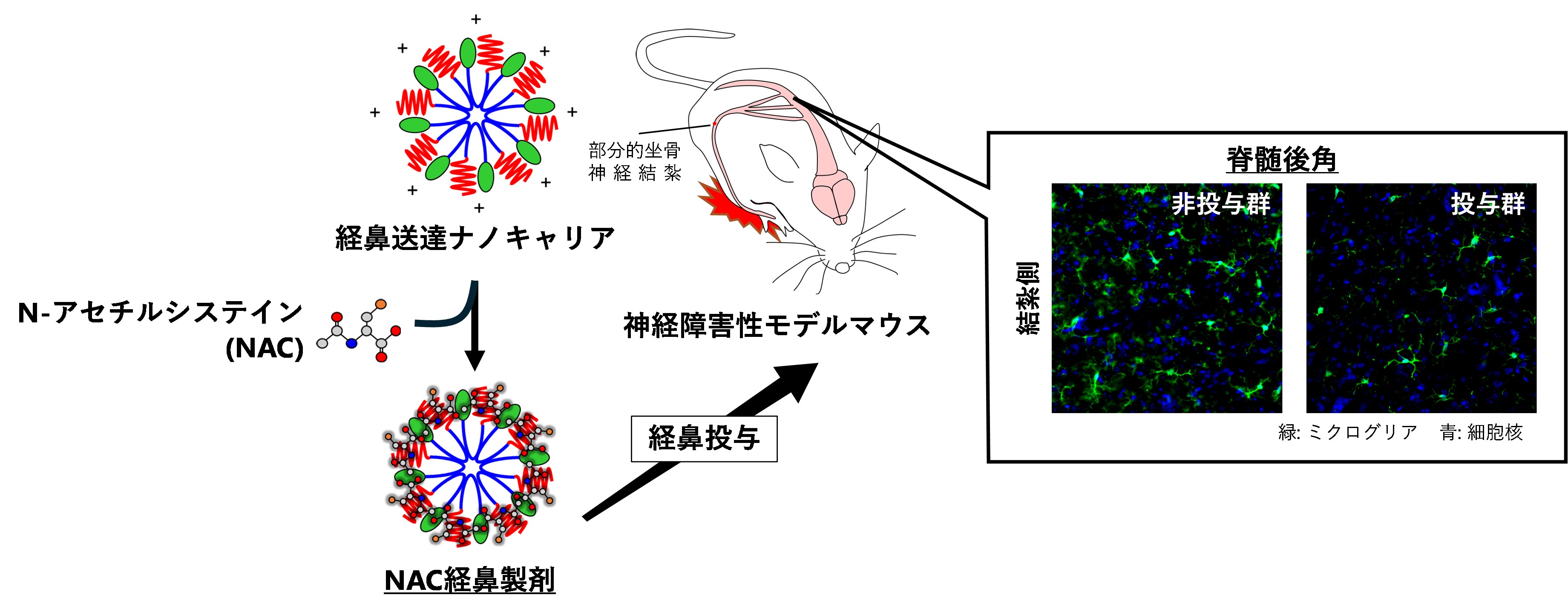 本研究では、神経障害性疼痛モデルマウスを用いて、本研究グループが開発した経鼻送達ナノキャリアと抗酸化物質N-アセチルシステイン(NAC)を組み合わせた経鼻製剤の治療効果を検証しました。その結果、NAC経鼻製剤が、末梢からの痛みの情報を伝える脊髄後角で生じるミクログリアの異常な発現増加を抑制することで、神経障害性疼痛を緩和する作用があることを見出しました。
