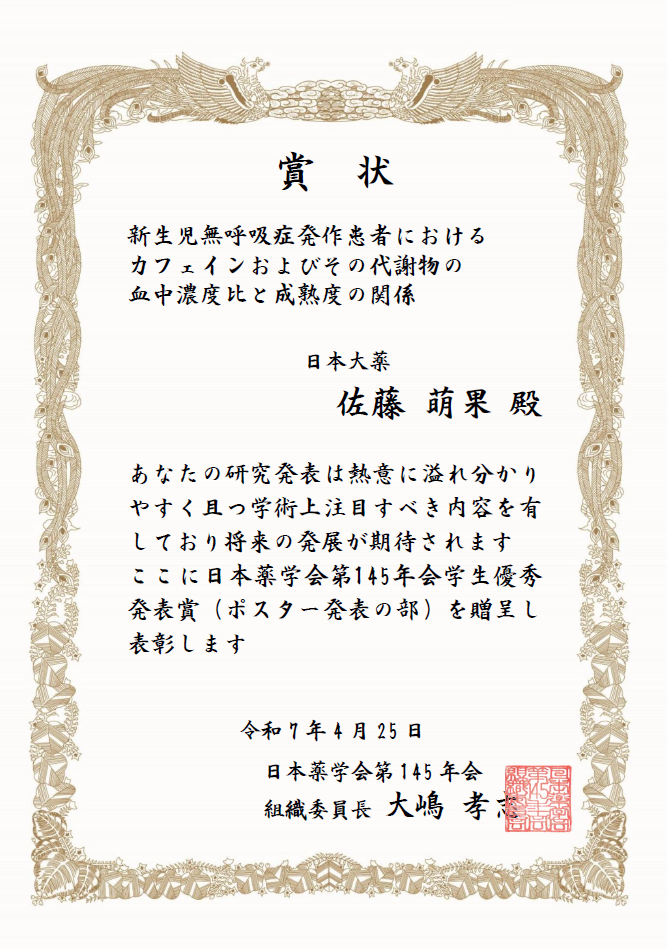 日本薬学会第145年会で臨床薬物動態学研究室の学生が学生優秀発表賞を受賞しました 2025年3月に開催されました日本薬学会第145年会において、臨床薬物動態学研究室6年生の佐藤萌果さんが、学生優秀発表賞を受賞しました。 研究課題「新生児無呼吸症発作患者におけるカフェインおよびその代謝物の血中濃度比と成熟度の関係」