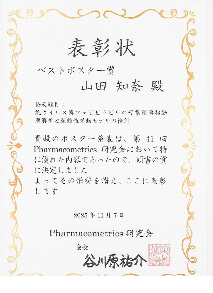 2025年11月に開催された第41回Pharmacometrics研究会において、臨床薬物動態学研究室5年生の山田知奈さんが、ベストポスター賞を受賞しました。