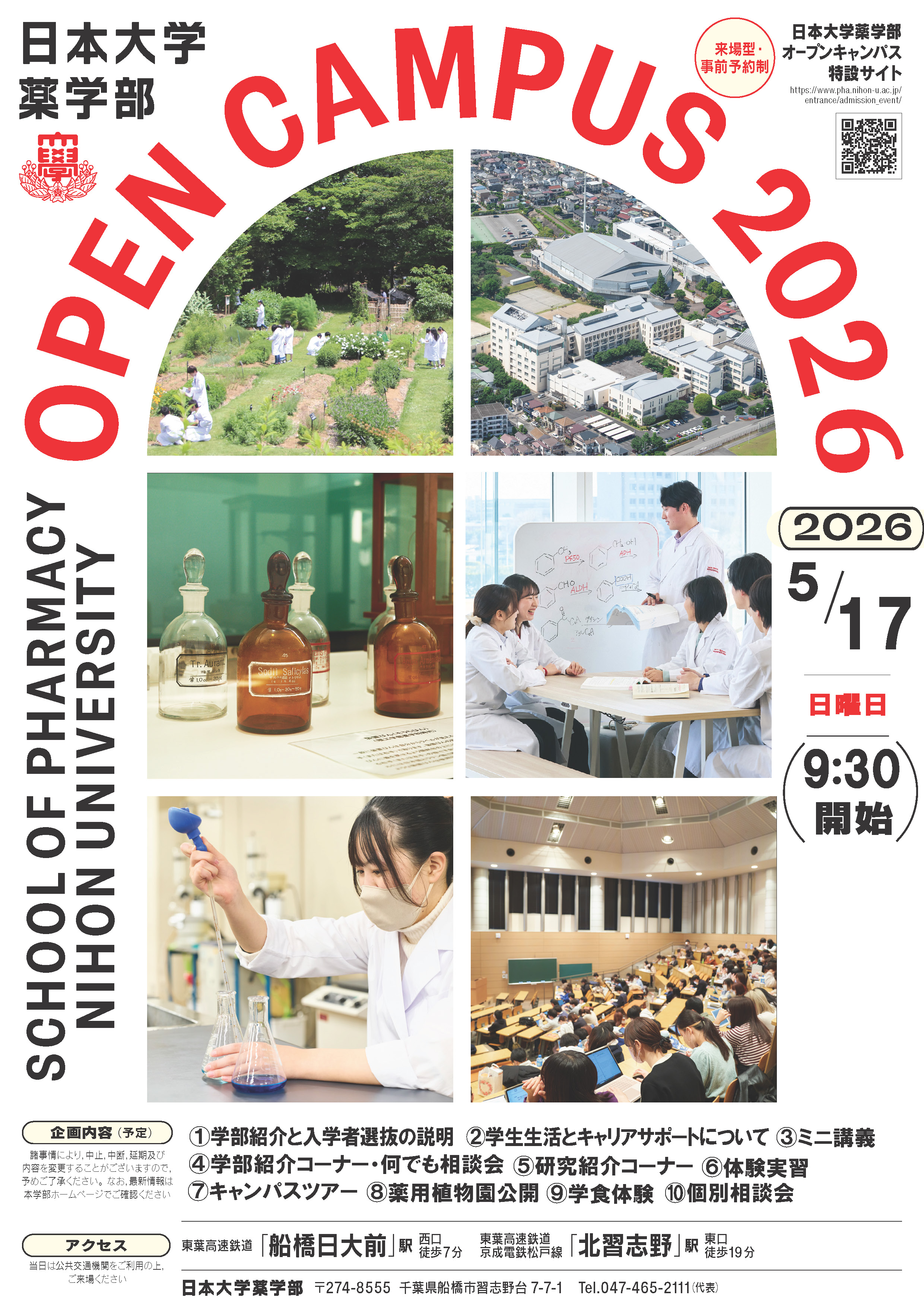 | 内容 | 学部紹介と入学者選抜の説明、学生によるキャンパスライフの紹介、学生生活とキャリアサポートについて、体験実習、ミニ講義、学食体験、キャンパスツアー、薬用植物園公開、フリーイベント(学生とのフリートーク、個別相談会~教職員が対応します~、研究紹介コーナー) |