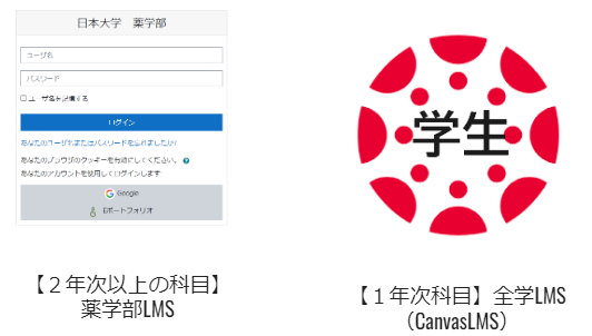 - 学生向け学内専用サイトリンク集が表示されるので、2年次以上の科目は薬学部LMS、1年次科目は全学LMS(canvasLMS)をクリックします。