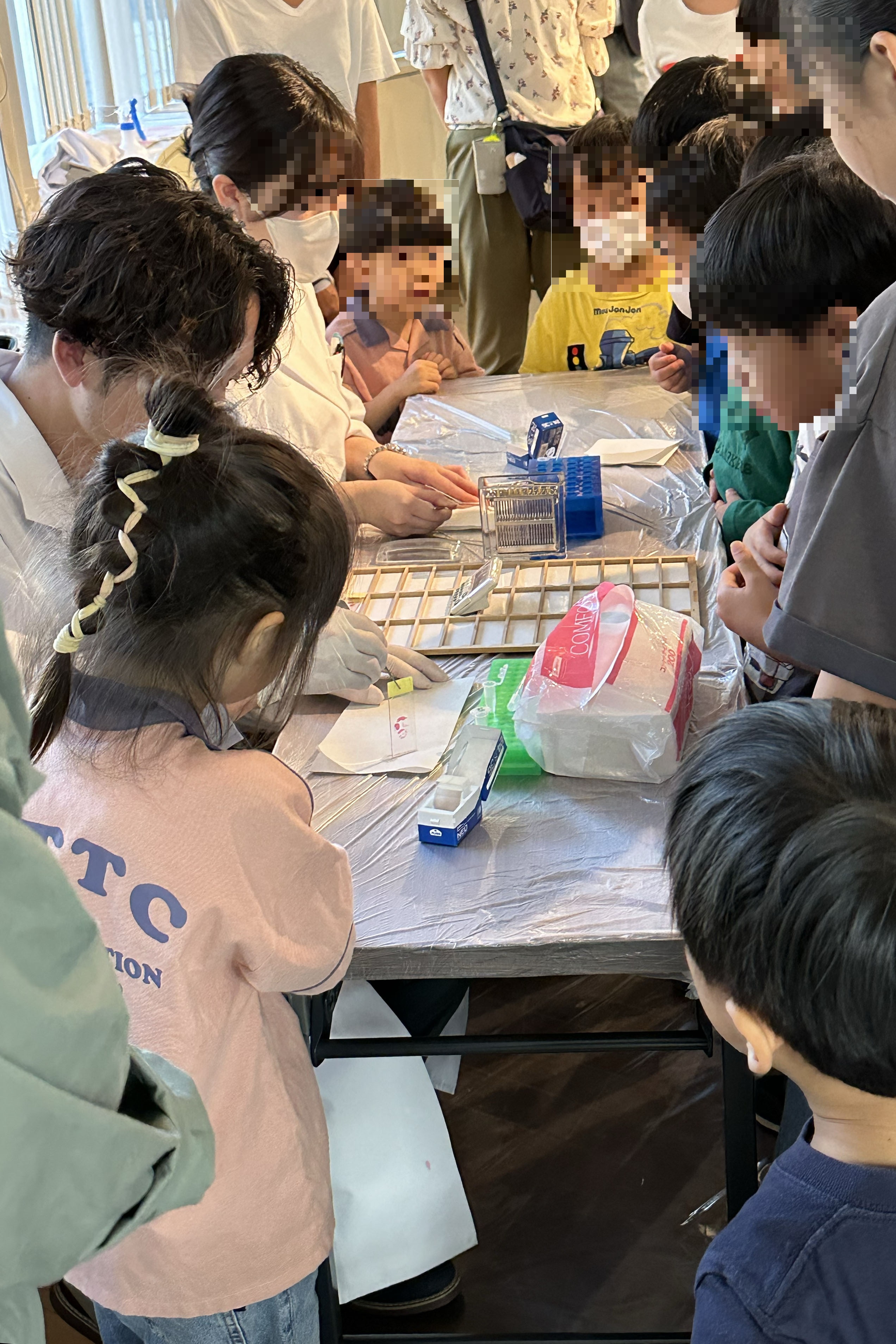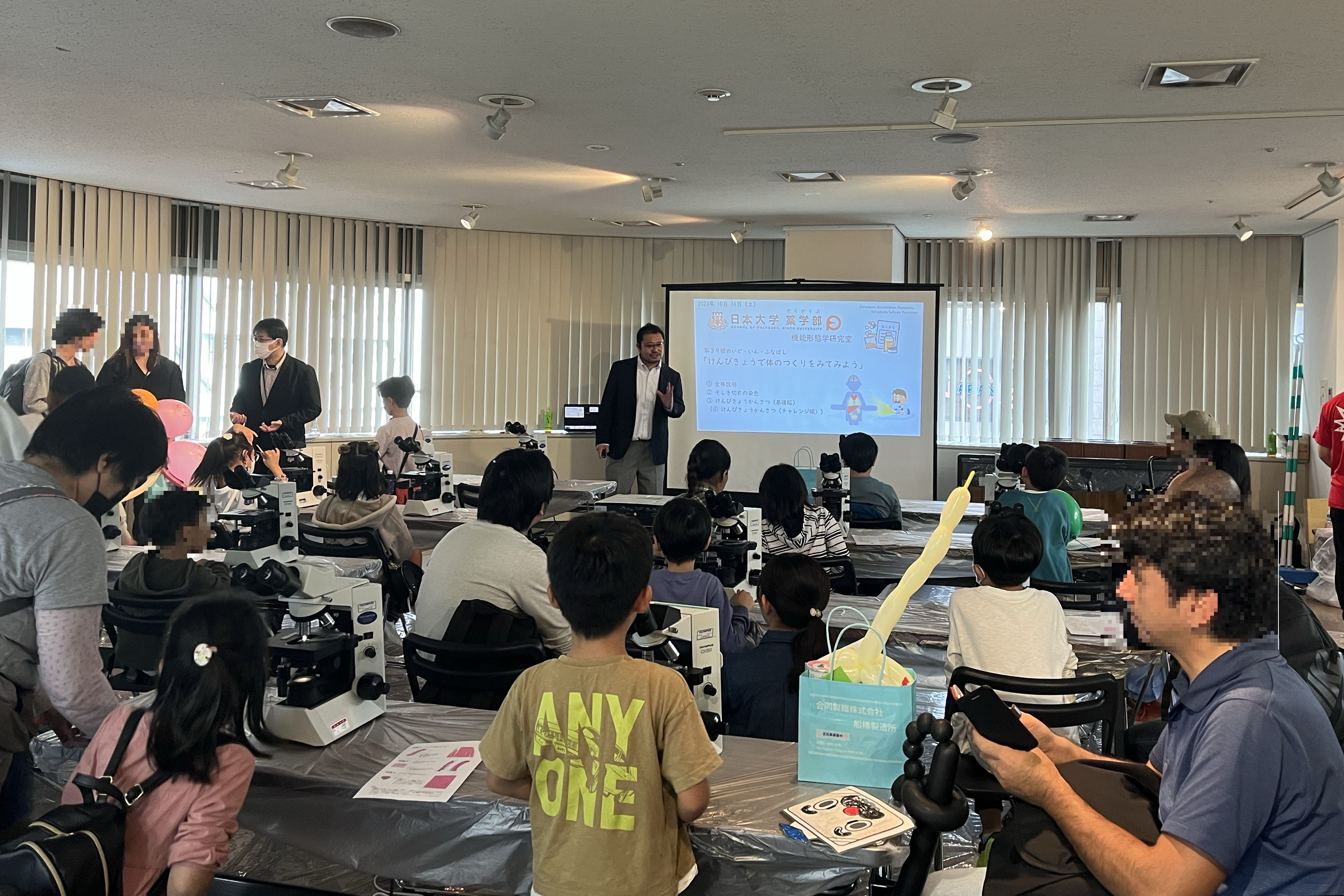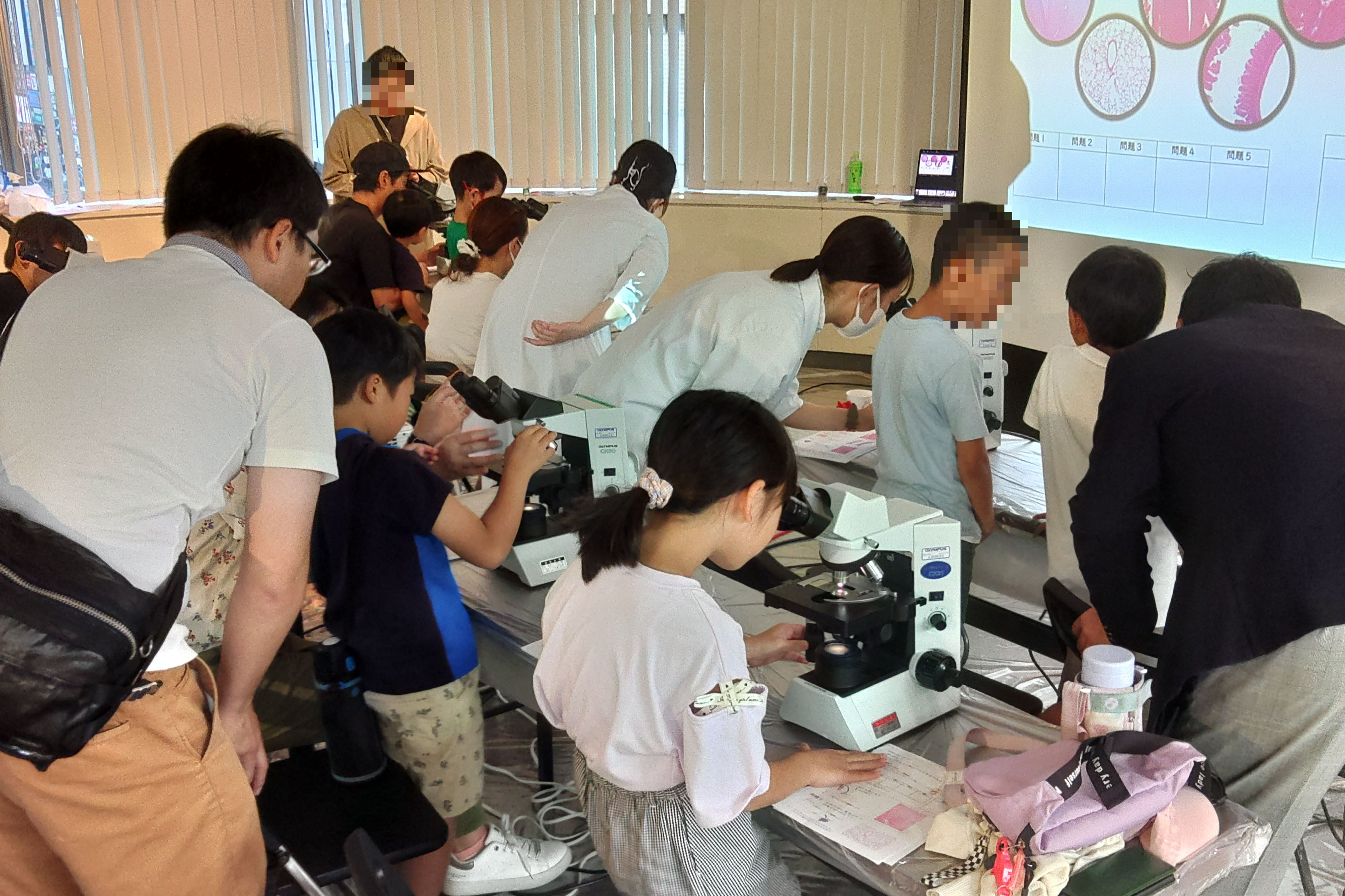 本学部からは、機能形態学研究室が14日に開催された科学実験「はかせくんとサイエンス体験会」に出展しました。主に小学生を対象に「けんびきょうで体のつくりをみてみよう」と題し、組織切片の染色と実際に大学で用いている顕微鏡を用いた観察を行いました。時間内に顕微鏡で課題の構造を探しながらポイントを獲得してゆくプログラムで、ゲーム感覚で体のつくりとそのはたらきを学べる内容でした。全ての課題をクリアした参加者には、観察した切片と認定証がプレゼントされました。