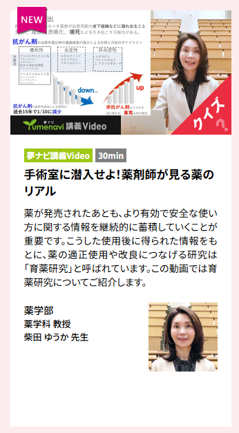 【夢ナビ】本学部の柴田ゆうか教授が「夢ナビ講義 Video」を公開しました 本学部の柴田ゆうか教授(薬剤師教育センター)が「夢ナビ講義 Video(オンデマンド動画配信)」を公開し、「手術室に潜入せよ!薬剤師が見る薬のリアル」講義を行いました。 講義に関しては以下をクリックすると視聴できますのでこの機会に是非御視聴ください。